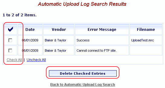 If you do not want to delete any entries, click the Back to Automatic Upload Log Search link.