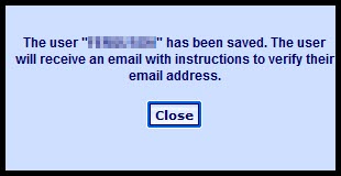 Email is a required field when creating a new user in Admin > Users > Add New User. When a new user is created, OSA will generate a verification email. A message displays, indicating The user "username" has been saved. The user will receive an email with instructions to verify their email address. Click Close to close this window.