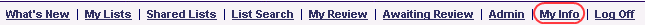The My Info option provides users the ability to configure Personal Information, Database (Search) Preferences, and Distribution Profiles.