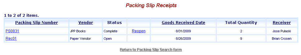 In Online Selection & Acquisitions (OSA), the Search Receipts option under the Receiving section of the Admin menu allows users with adequate permissions the ability to search for Packing Slips associated with a specific vendor, or with all vendors. From the Packing Slip Search Results list you can then open a packing slip by clicking the underlined Packing Slip Number. You can also click the Reopen link for completed packing slips.