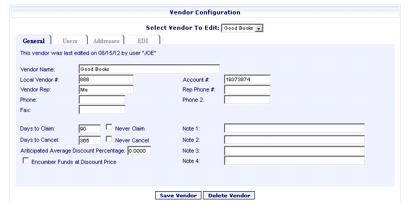Note: If only one (1) vendor is configured the Select Vendor To Edit drop-down will not display.
